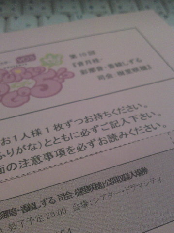 というわけで帰りに、9日2階席買い足そうと思ってチケットカウンターに寄ったんですが。お金ないので2階R。前方席やら通路側は売り切れててがっくり。どーしよーかなー。
